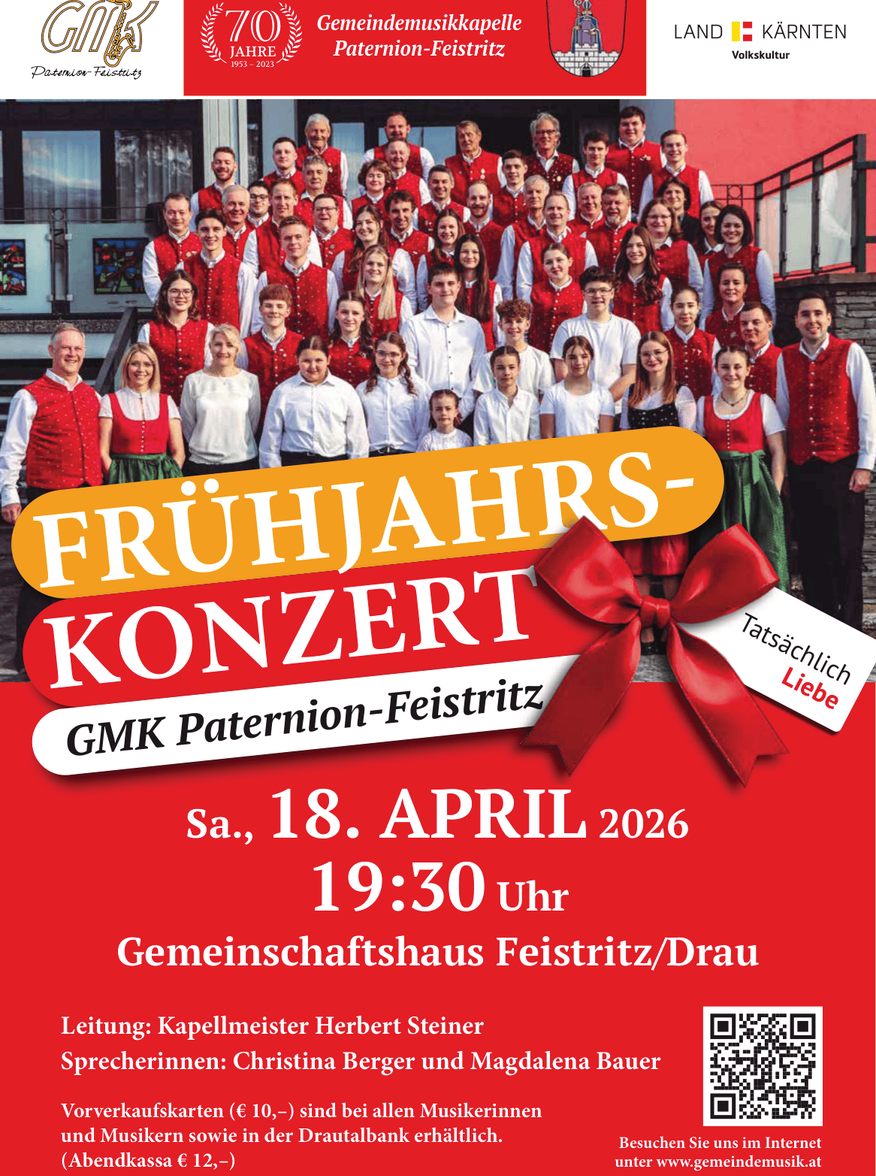 Die GMK Paternion-Feistritz kommt aus der Marktgemeinde Paternion in Kärnten (Österreich) und wurde 1953 gegründet und steht seit über sieben Jahrzehnten für gelebte Blasmusik und starke Gemeinschaft. Besonders stolz sind wir auf unsere ausgezeichnete Kameradschaft, die man bei jedem Auftritt deutlich spürt. Neue Mitglieder sind bei uns jederzeit herzlich willkommen – ganz unabhängig vom Alter.
